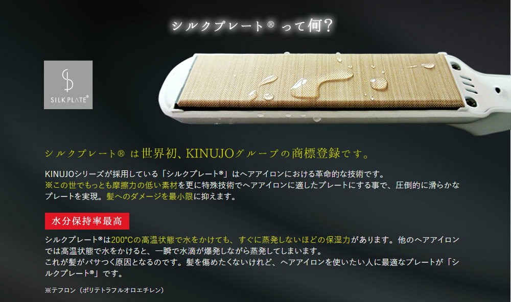 豆知識 ※髪の水分を守る秘密 テフロンを布状に特殊加工したシルクプレートは 200℃の高温状態で水をかけても、蒸発しないほどの保湿力があります。